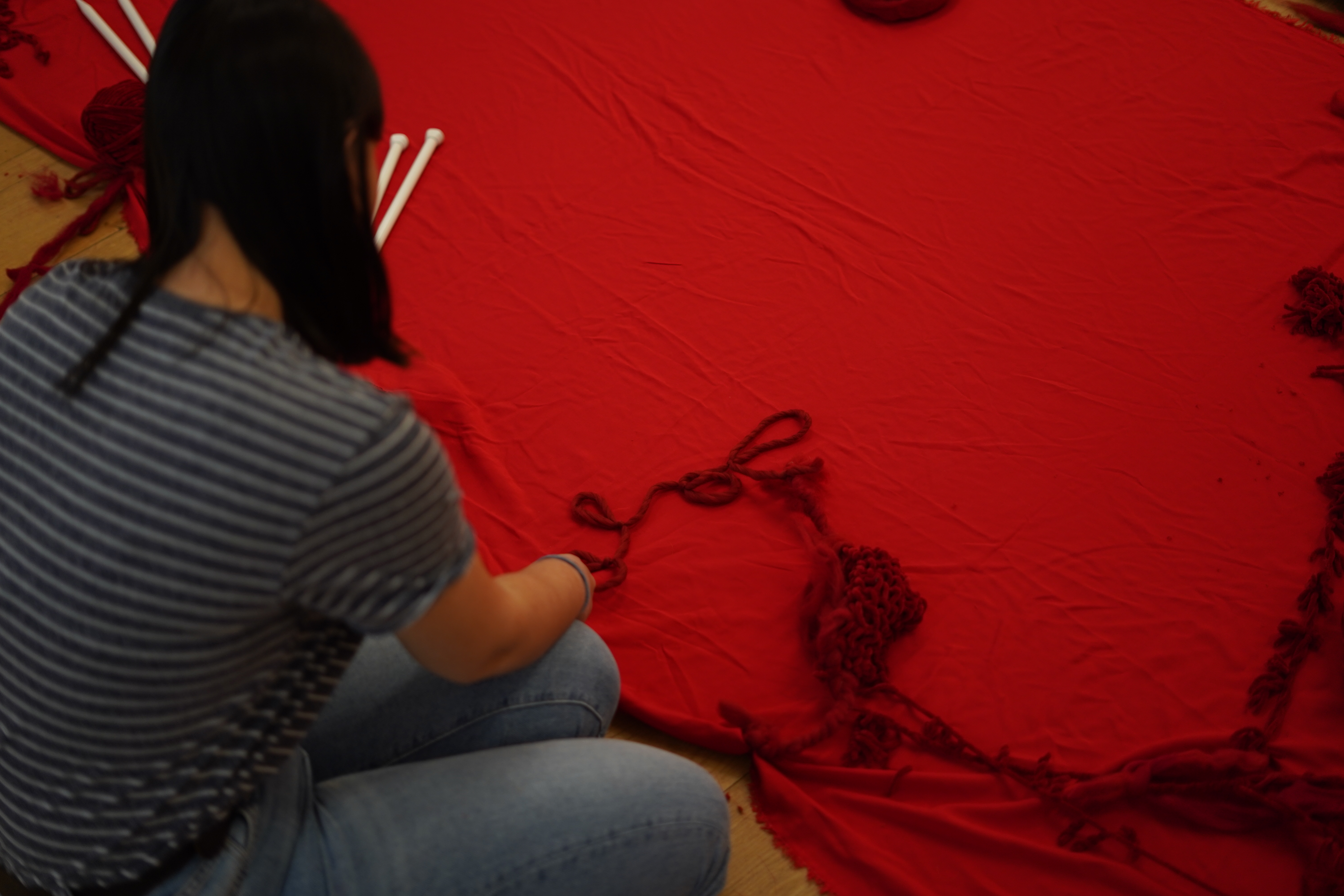 Altogether, this multi-layered work critiques invisible labor as none of the main artistic branches can be seen directly (the booties, the performances, the embroidered poem) while exploring three types of healing: the acceptance of femininity, the therapeutic effect of repetition in movement, and the post-structural expression ingrained in feminine writing. And by knitting this exploration into a range of female-dominant artistic branches, it invites the viewer to reflect on the manifold interplays of identity construction and gender politics, through a needle, a pen and the body itself.